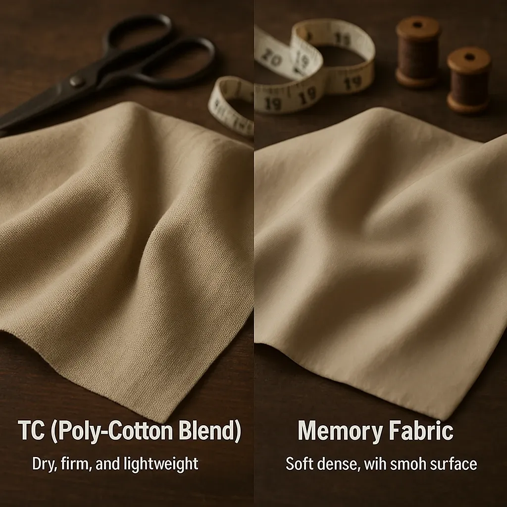 اگر هر دو پارچه را کنار هم لمس کنید، تفاوت فیزیکی آن‌ها بلافاصله احساس می‌شود. پارچه تی‌سی بافتی خشک، محکم و درعین‌حال سبک دارد، در حالی که مموری نرم‌تر اما فشرده‌تر به نظر می‌رسد. هنگام تا خوردن، پارچه تی‌سی برای صاف شدن به اتو نیاز دارد ولی مموری به‌طور طبیعی به فرم نخست برمی‌گردد. این ویژگی در دوخت لباس‌های مد، مخصوصاً در فرم‌دهی قسمت‌هایی مثل آستین یا یقه امتیاز بزرگی محسوب می‌شود.